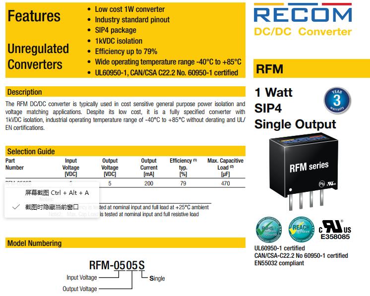 原装进口RECOM: RFM-0505S