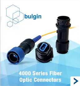 Bulgin 4000 Series Fiber Optic Connectors are one of the smallest harsh environment optical connectors that range from 5m to 450m in length. These connectors feature a secure quick twist bayonet connection that gives durable mechanical mating. The 4000 fiber optic connectors are available in both single-mode OS1 and multi-mode OM1 and OM3 cabled versions. These connectors use a simplex LC-type interface and provide an IP68/IP69K rating once mated. Typical applications include harsh environments, telecom, industrial, server rooms, marine, and civil engineering.